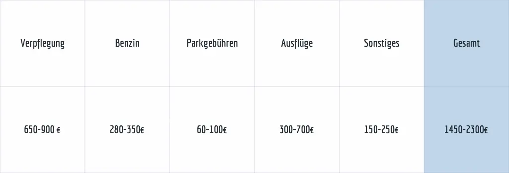 Für eine 10-tägige Islandreise mit 2 Erwachsenen und 2 Kindern sollte bei Selbstverpflegung im Ferienhaus für die Ausgaben vor Ort mit etwa 1.500 bis 2.300 € gerechnet werden. Darin enthalten sind Lebensmitteleinkäufe, Benzin für eine typische Route durch Südisland inklusive Golden Circle, Parkgebühren, ein bis zwei familienfreundliche Ausflüge sowie kleinere Ausgaben unterwegs.